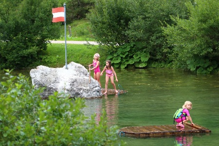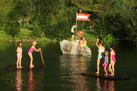 Samstag, 10. August. Die Bahnfahrt verlief ohne Zwischenfälle und so erreichten wir schon um 14:30 Obertauern. Die Berge waren noch in den Wolken, aber es herrschten angenehme Temperaturen. Die Zimmer waren schnell bezogen und kurz darauf trauten sich schon die ersten Kinder auf die Flöße.