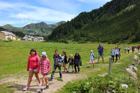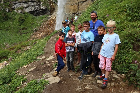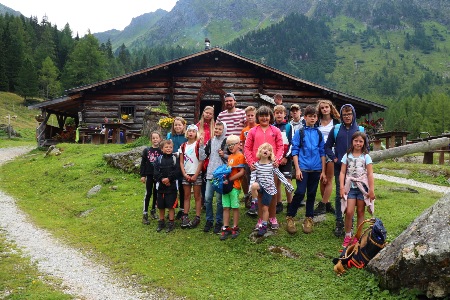 Donnerstag, 15. August. Vormittags veranstalteten wir eine kleine Olympiade, bei der die Kinder viel Geschicklichkeit und Ausdauer zeigten. Nachmittags spazierten wir zum Johanneswasserfall und weiter zur Gnadenalm.