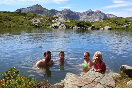 Samstag, 17. August. Mit der Seilbahn fuhren wir zum Grünwaldsee. Hier entstand am Beatles-Klavier ein erstes Gruppenfoto. Weiter ging es an kleineren Bergseen zur Panoramaaussicht zum Krumschnabelsee. Hier machten wir Mittagspause und wagemutigsten wagten sich in den Bergsee. Den Rückweg nach Obertauern verbanden wir mit einer Rast an der Dikt'n-Alm.